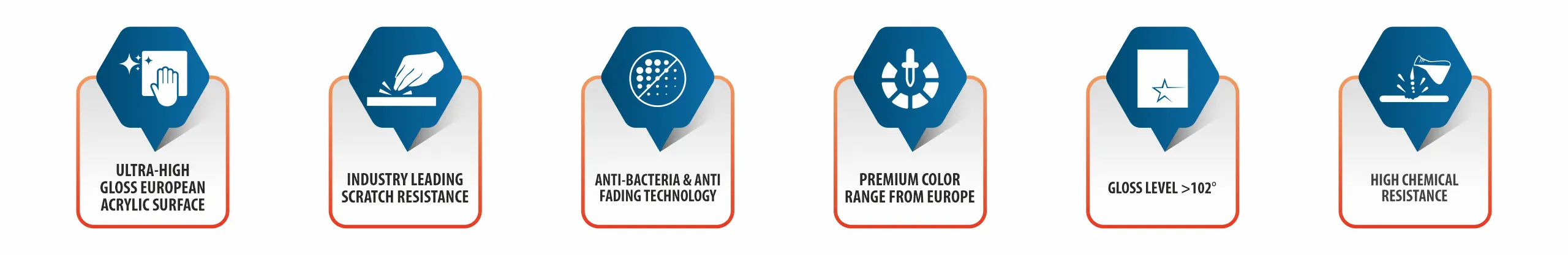 The best quality European Acrylic sheet is far superior compared to similar products available in the market due to the great depth effect and clearly piano gloss. The scratch resistance is infinitely superior compared to other high gloss surfaces. The chemical and stain resistance is so improved that it can be used in all kitchen applications and the UV resistance has been greatly increased for colour stability.